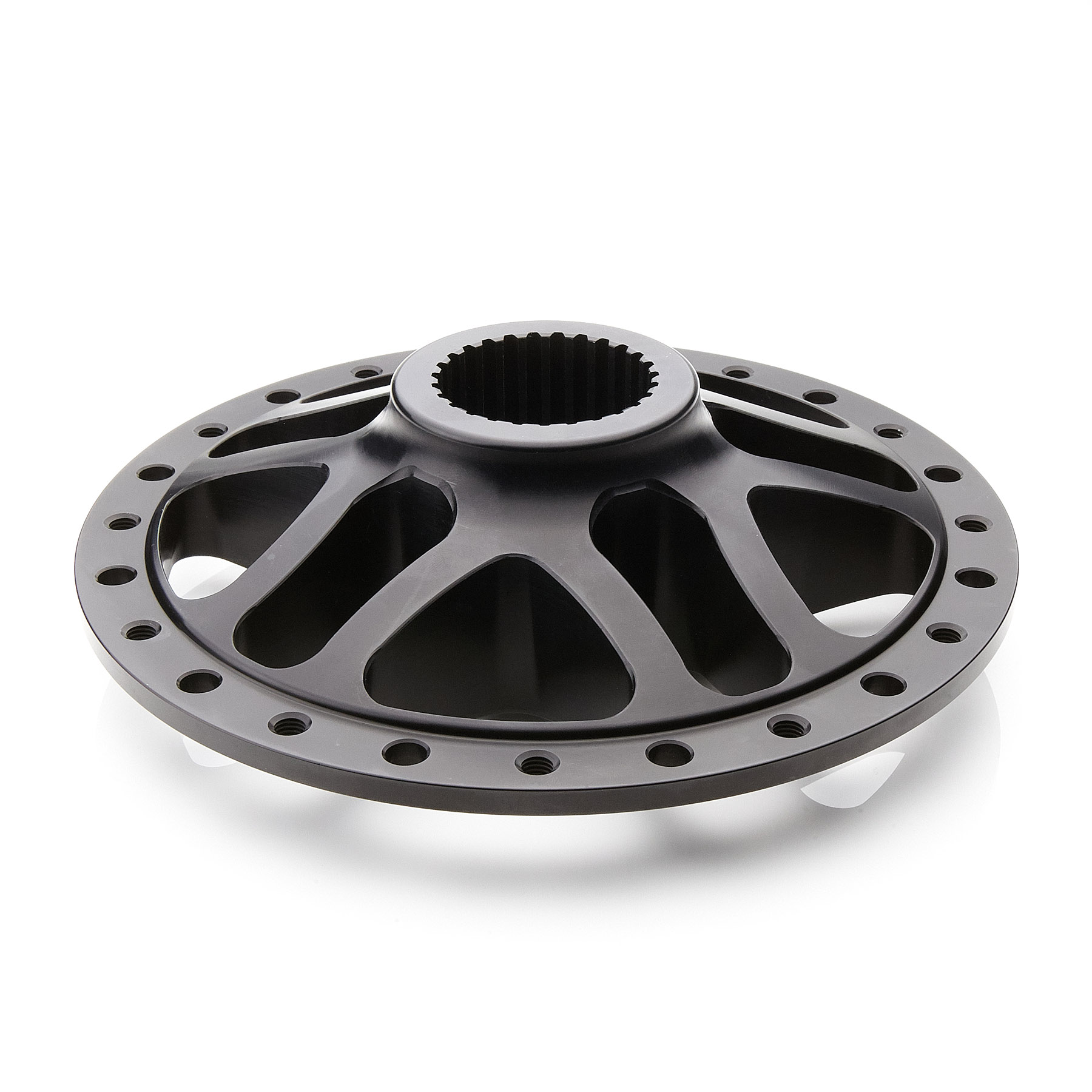 Our micro sprint 10″ wheel center hub has 12) 1/4-28 fine threaded holes. No need for heavy steel threaded inserts or nuts. Hubs come anodized black and fit the 1-3/4 splined axle.